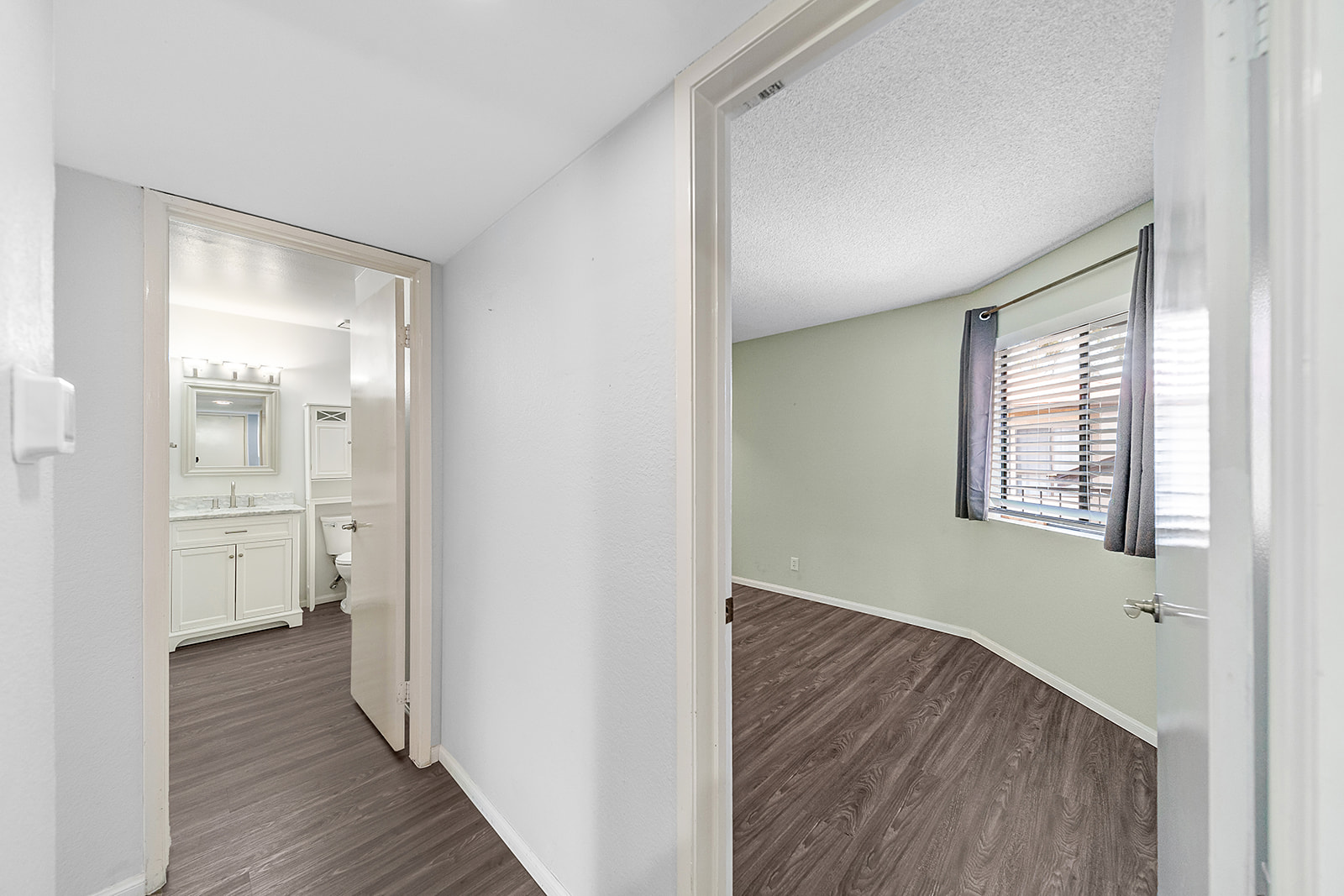 The primary bedroom is spacious with an en-suite bathroom and walk-in closet. The second bedroom is a nice size as well, with its own walk-in closet. The shared hallway bathroom is updated with a marble vanity top and new lighting.