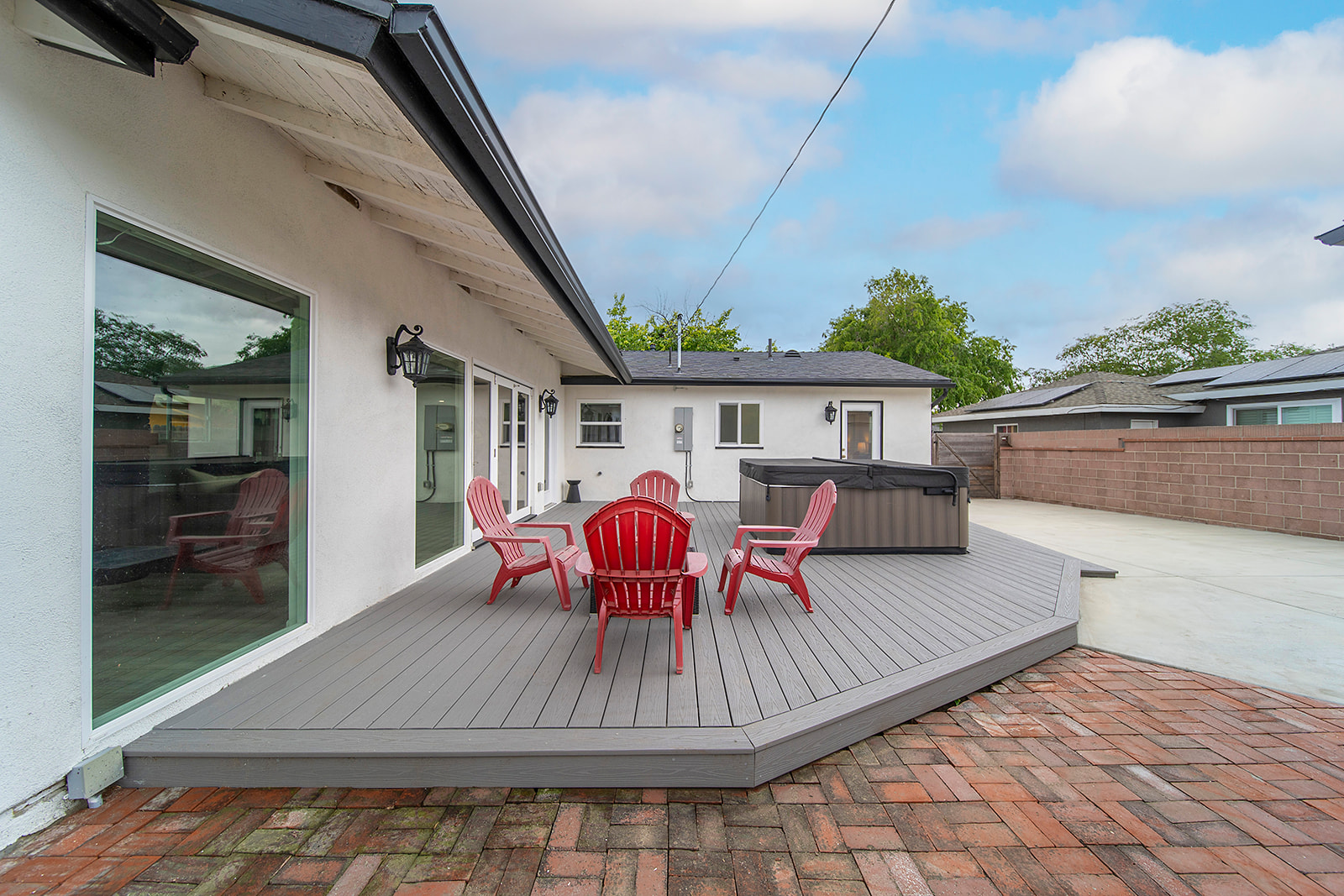 The inviting backyard is a highlight, featuring a Trex deck with a spa and mature landscaping, including multiple roses and fruit trees. This is a peaceful retreat for entertaining and everyday living.